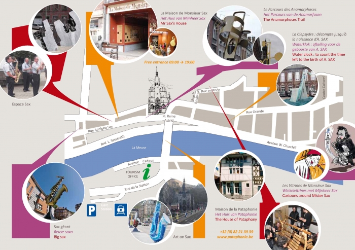 Iedereen kan, vrij en in eigen tempo, vertrekken in het Voetspoor van Adolphe Sax. De brochure Sax and the City, met een stadsplan waarop al deze locaties zijn aangeduid, is gratis te verkrijgen aan het onthaal van het Maison du Tourisme de la Haute-Meuse dinantaise en van het Royal Syndicat d'Initiative de Dinant (Quai Cadoux, 8, Dinant, 082/22.90.38) en van het Centre Culturel Régional de Dinant (Rue Grande, 37, 5500, Dinant).